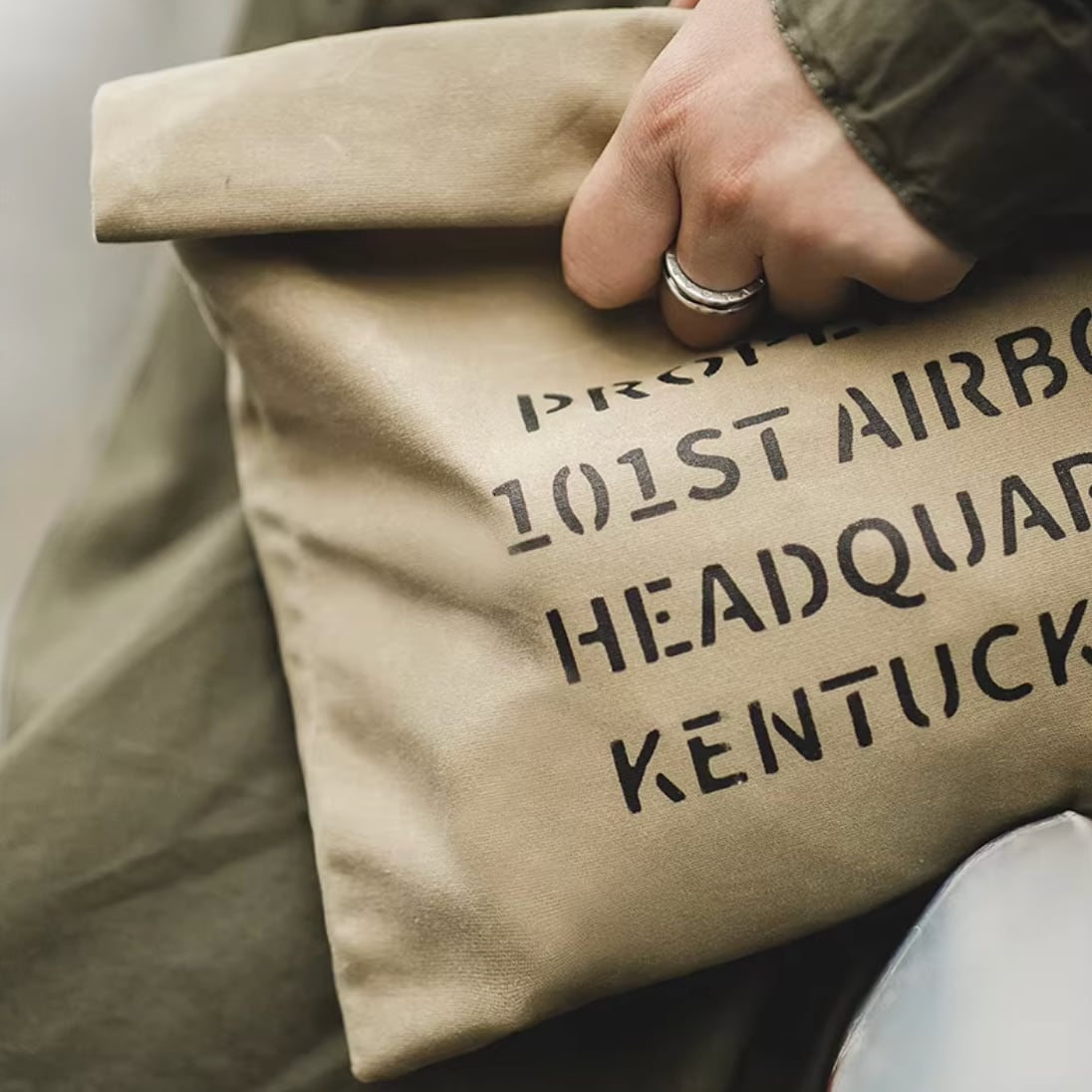 耐久性のあるオイルワックスキャンバス素材を使用したユニセックス仕様のハンドバッグ。